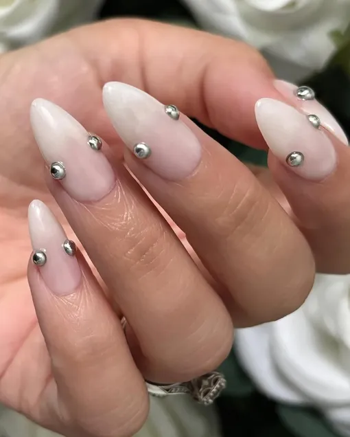 Аура-маникюр никуда не уходит, а оформить его этой зимой предлагаем в панк-стиле! Это будто подсвеченное изнутри омбре выглядит еще волшебнее, когда его украшают несколько стальных шпилек.