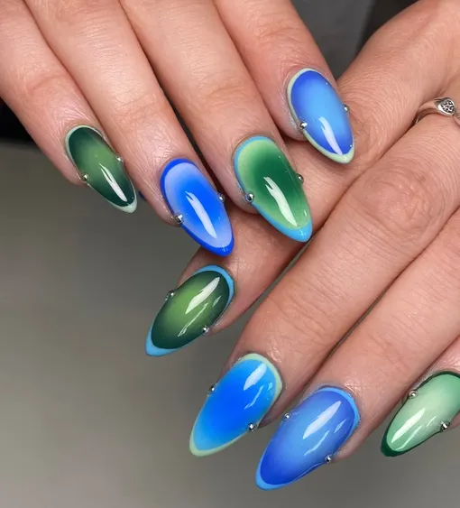 Этот завораживающий сине-зеленый маникюр по-настоящему притягивает взгляды. Благодаря глубоким насыщенным оттенкам и всего паре изящных серебряных деталей ты попадаешь не в бровь, а в глаз, чтобы быть эффектной, но не перегнуть.