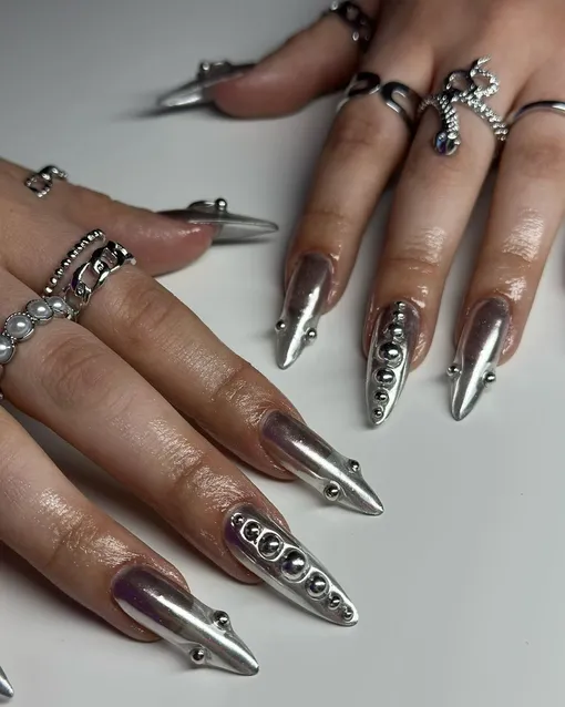 Идеальным аксессуаром к футуристичным хромированным ногтям станут серебряные украшения, имитирующие пирсинг. Такой дизайн точно придется по душе ценителям фантастики.