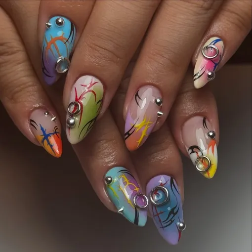 Этот аэрографический нейл-арт дополнен пирсингом на максимум: по два-три украшения на каждом ногте. Выглядит так, будто твои ногти побывали на самой крутой вечеринке в городе.