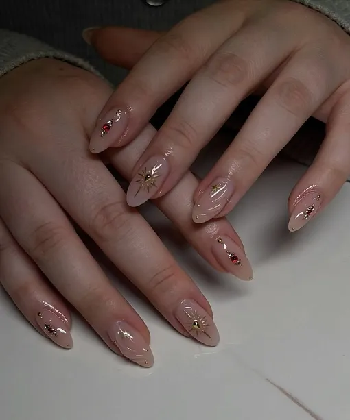 Золотые бусинки на глянцевой базе добавляют маникюру нарядности. Их можно плотно закрепить топом, чтобы не беспокоится о том, что они могут за что-то зацепиться.