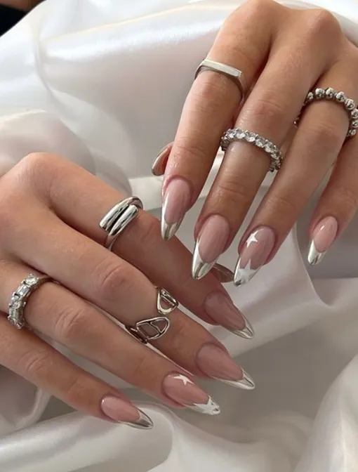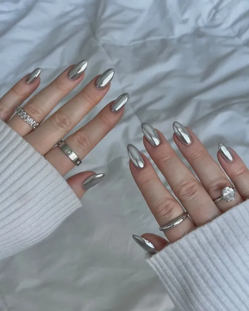 Если ты фанат металлической бижутерии и серебряных украшений, то такой маникюр не только подчеркнет длину, но и будет органично смотреться со всеми аксессуарами в твоей шкатулке!