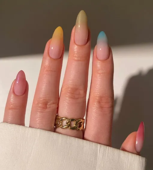 Хочется немного цвета? Супер! Добавь яркие кончики ногтю, пройдясь губкой для плавного перехода из нюдовой базы в цвет. Топпер с мелким глиттером придаст маникюру еще больше яркости и позитива.
