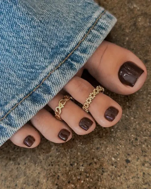Глубокий коричневый цвет напоминает о приближении осени. Такой педикюр — переходный между летним и осенним настроением: еще сочный и заметный, но уже более спокойный и сдержанный.