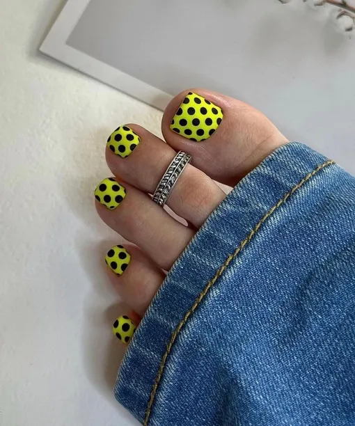 Яркий неон на базе и черный горох сверху — педикюр, который напоминает винтажную брошь или графичный браслет в стиле поп-арт. Лаконичный рисунок превращается в смелый акцент, который точно не требует дополнительных блесточек.