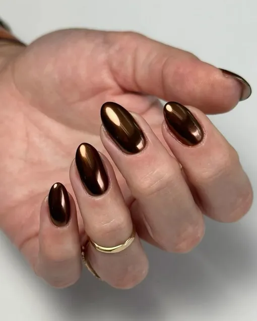 Хромированный маникюр в медном варианте - один из самых эффектных способов примерить тренд. Сочетание дорогого оттенка и зеркального блеска сразу напоминает бокал «Московского мула».