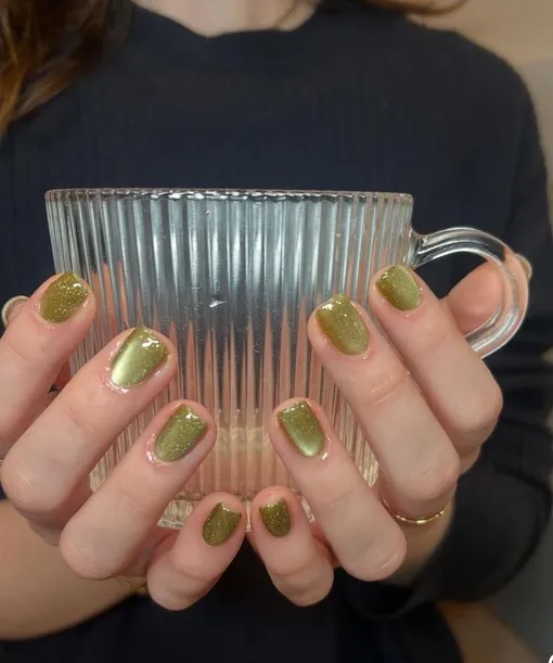 Этот мерцающий бледно-зеленый маникюр не только напоминает сладкий коктейль с мятой, но и отлично смотрится в новогодней эстетике.