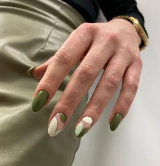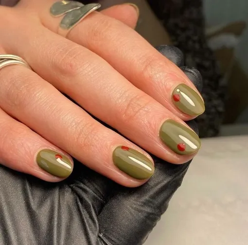 Зеленые ногти миндалевидной формы гарантированно станут главным поводом для обсуждений на любой вечеринке. Красные акценты делают дизайн концептуальным изображением оливки.