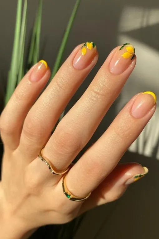 Этот элегантный маникюр сразу вызывает ассоциации с освежающим лимончелло. В дизайне подружились и сливочно-желтые кончики и тематический нейл-арт. Идеальный вариант для тех, кто уже мечтает о лете :)