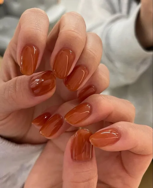 Этот маникюр вдохновлен виски с колой - глубоким, теплым и немного дерзким коктейлем. Прозрачные карамельно-коричневые оттенки с глянцевым финишем напоминают янтарный цвет напитка в бокале и его плотную, тягучую текстуру.