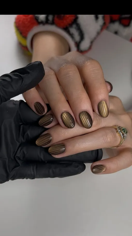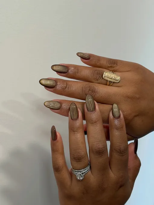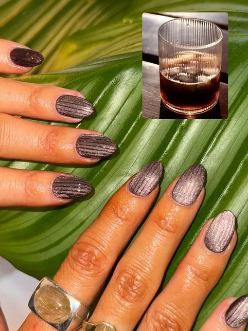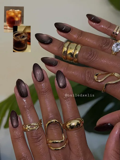 Хотя маникюр с эффектом рифленого стекла можно сделать в любой палитре, одна цветовая гамма здесь прочно удерживает звание лидера. Коричневые тона были доминирующим трендом и продолжат быть на пике популярности и в 2026 году. Теплые нейтральные оттенки в паре с глянцевым полупрозрачным сиянием на ногтях будут напоминать движение напитка в стакане с аккуратными гранями.