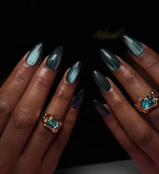 Этот приглушенный бирюзовый оттенок с холодными серебристыми линиями напоминает морскую ракушку, отшлифованную волнами. Такое покрытие на ногтях будто хранит в себе прохладу и тихий блеск прибрежных камней.