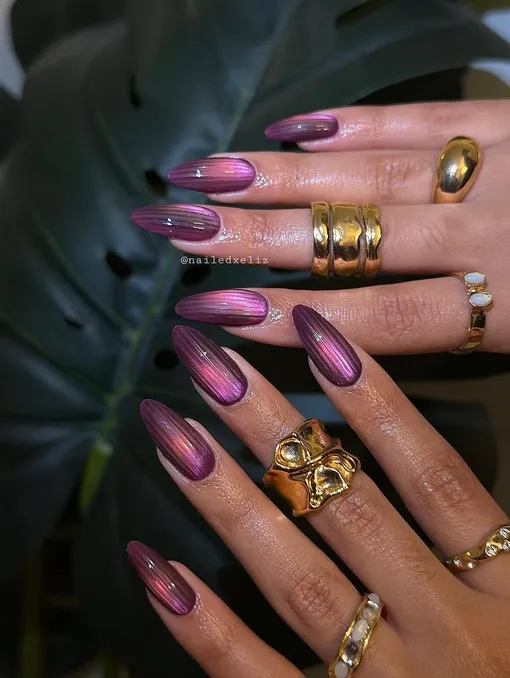 С этим маникюром глубокая и мерцающая вселенная ожидает прямо на твоих ногтях. Именно так в этом дизайне ощущается магический перелив от серебра к глубокому фиолетовому.