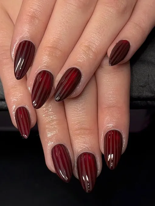 С этим маникюром ты попадешь сразу в два тренда: на классический бордовый лак и узор «рифленое стекло». Итог: стиль, возведенный в абсолют.