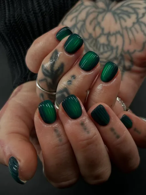Глубокий зеленый оттенок сразу навевает нам мысли о стариных бутыльках из рифленого стекла. Чтобы сделать оттенок по-настоящему насыщенным, попроси мастера нанести магнитный лак на черную подложку, тем самым подарив цвету невероятную глубину и сочность.