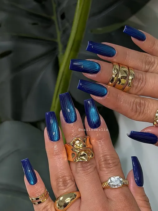 Глубокий и насыщенный магнитный лак в темно-синем оттенке преображается на свету, словно ночное море. Глянцевые «ребра» в дизайне работают как призма: они ловят лучи и рассеивают их, заставляя цвет «вспыхивать» яркими лазурными всполохами.