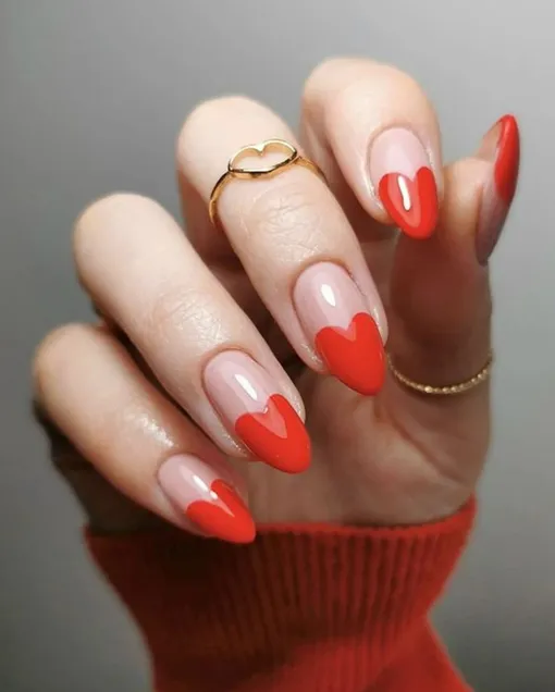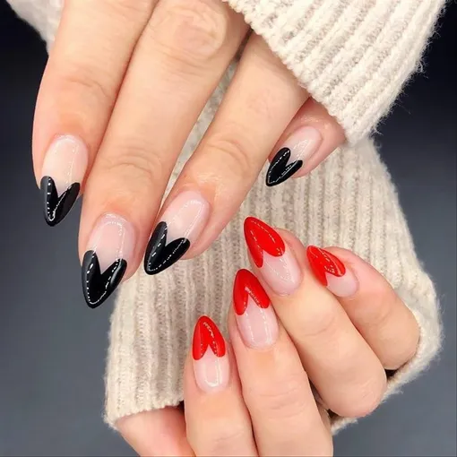 Красный — всегда хорошая идея, когда речь заходит о макияже или маникюре. В этот раз попробуй покрыть базовым оттенком не все ногти целиком, а только кончики. С размером сердечек ты не прогадаешь: маленькие будут смотреться женственно и аккуратно, а большие — очень броско и эффектно.