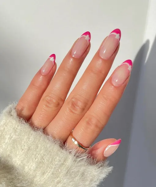 Этот вариант наиболее приближен к классическому френчу из всех представленных в подборке. Отличают его тонкие линии и крошечные белоснежные сердца, ненавязчиво разместившиеся на розовых кончиках.