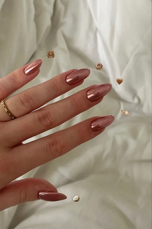 Сначала поговорим про зеркальный металлик с розово-карамельным отливом. Такой маникюр сразу бросается в глаза, выглядит эффектно и празднично. Он идеально подойдет тем, кому хочется сделать акцент на ногтях и добавить блеска в образ.