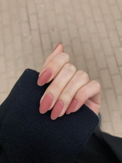 Второй вариант — матовый финиш в приглушенно-розовом оттенке. Он выглядит очень уютно и элегантно, отлично сочетается с темными пальто и мягкими свитерами. Такой маникюр подойдет на каждый день осени и точно будет радовать глаз.
