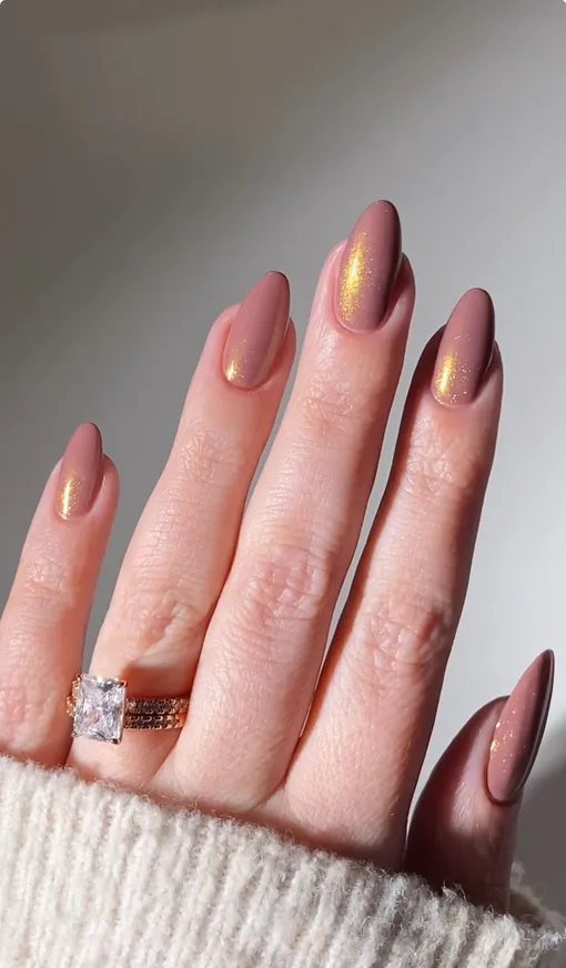 Мягкий пыльно-розовый с золотым шиммером. Легкое свечение на ногтях добавляет изюминку, но при этом остается деликатным. Отличный способ освежить базовый оттенок без лишнего декора. Один из самых изящных и красивых вариантов из всех нами найденных.