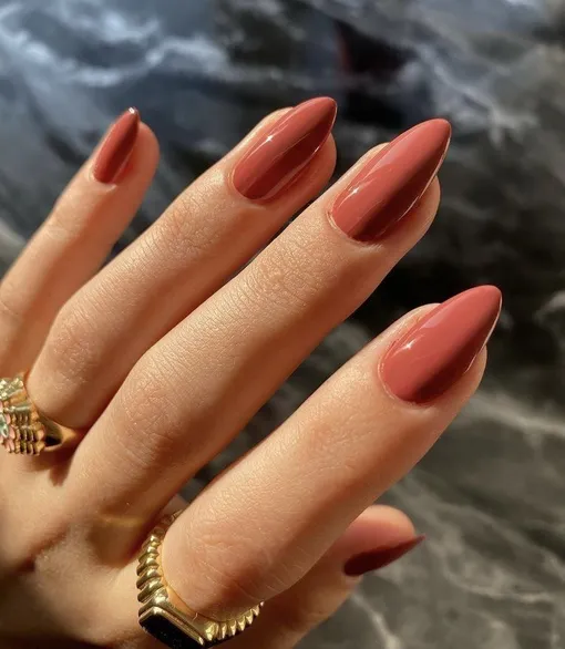 Последний вариант — теплый красно-терракотовый. Это уже смелее и ярче, чем предыдущие. Такой маникюр добавляет энергии и круто работает как цветовой акцент даже в самом простом образе.