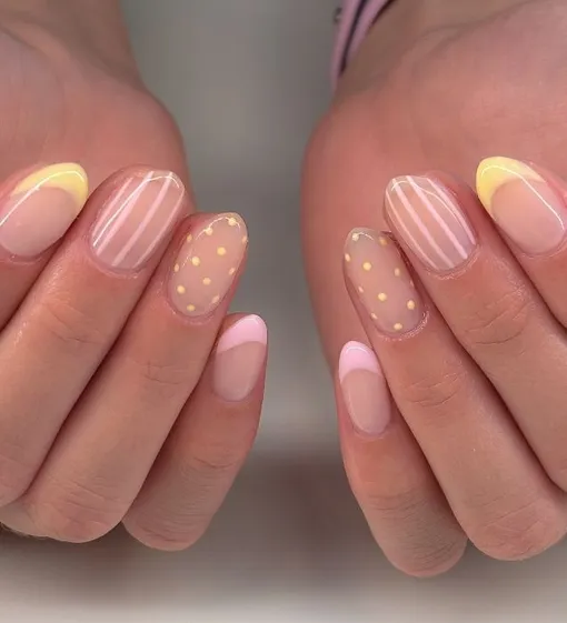 Полупрозрачная база с акцентом на светло-желтый и розовый — это как карамельные конфеты в детстве. Одни ногти украшены тонкими белыми линиями, другие горошком, а часть выполнена с минималистичным френчем. Такой микс смотрится озорно и при этом невероятно утонченно.