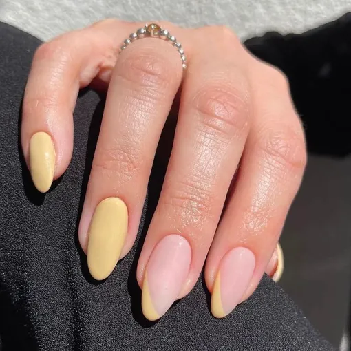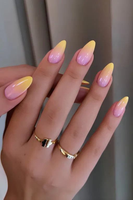 Плавный переход от нежно-розового к теплому желтому — настоящее фламбе на ногтях. Маникюр напоминает о последних теплых закатах осени, когда солнце окрашивает небо в пастельные тона. Идеален для длинных миндалевидных ногтей.