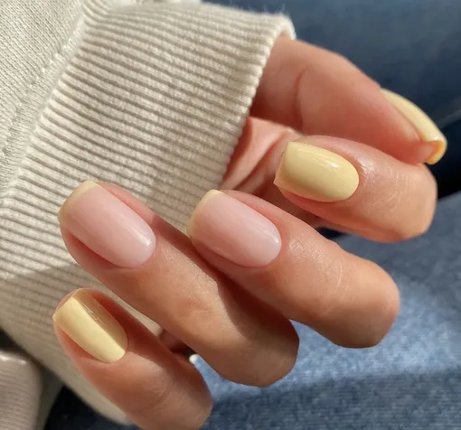 Квадратная форма и чередование розового нюда с ванильным глянцем — для тех, кто выбирает простоту и элегантность. Ногти выглядят ухоженно, но не перегруженно, что делает дизайн универсальным для любой осенней ситуации.