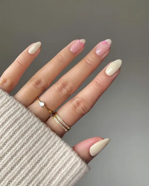 Классическая база в розовом и ванильном оттенке чередуется на каждом пальце. Дополнительный акцент — мягкий френч в форме лепестка. Лаконично, но с изюминкой: маникюр подойдет и для офиса, и для свидания.