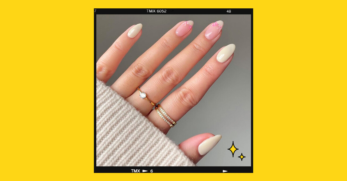 Классическая база в розовом и ванильном оттенке чередуется на каждом пальце. Дополнительный акцент — мягкий френч в форме лепестка. Лаконично, но с изюминкой: маникюр подойдет и для офиса, и для свидания.