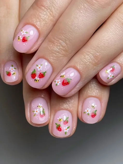 Наклейки или рисунки — еще один маникюрный тренд этого лета. Добавь к розовой базе миниатюрные клубнички и другие детали — например, крошечных пчелок или цветы. Получится немного по-детски и наивно, но ни в коем случае не глупо.