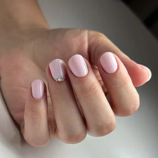 В качестве базы выбери аккуратный зефирно-розовый и покрой им все ногти. Потом добавь блестящий акцент на одном или лвух пальчиках: это могут быть стразы, пайетки или маленькие сердечки. Легкий блеск сделает образ чуть игривым, но без эффекта «девочка на выпускном».