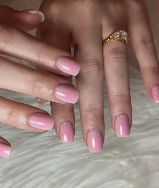 Нежный градиент от центра ногтя к краям, где основа — зефирный розовый, а по бокам — туман из белого, персикового и сиреневого. Выглядит такой маникюр очень воздушно и нежно, а еще показывает, что ты следишь за трендами.