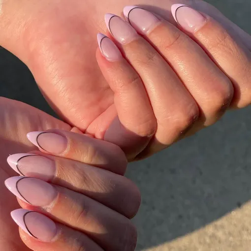 Если хочется чего-то менее банального, оставь розовую базу, но обведи кончики по зоне улыбки тонкой черной линией. Маникюр сразу же станет чуть более дерзким, но цвет по-прежнему будет его смягчать. Такой контраст работает на «отлично».