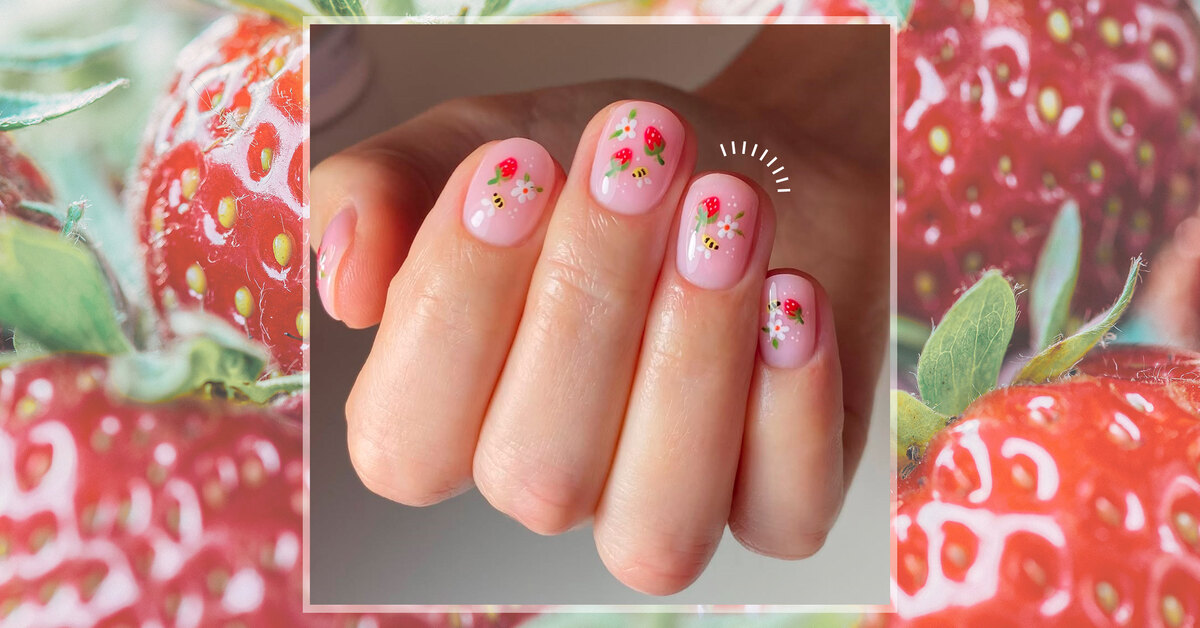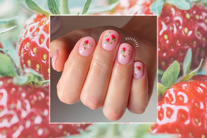 Наклейки или рисунки — еще один маникюрный тренд этого лета. Добавь к розовой базе миниатюрные клубнички и другие детали — например, крошечных пчелок или цветы. Получится немного по-детски и наивно, но ни в коем случае не глупо.