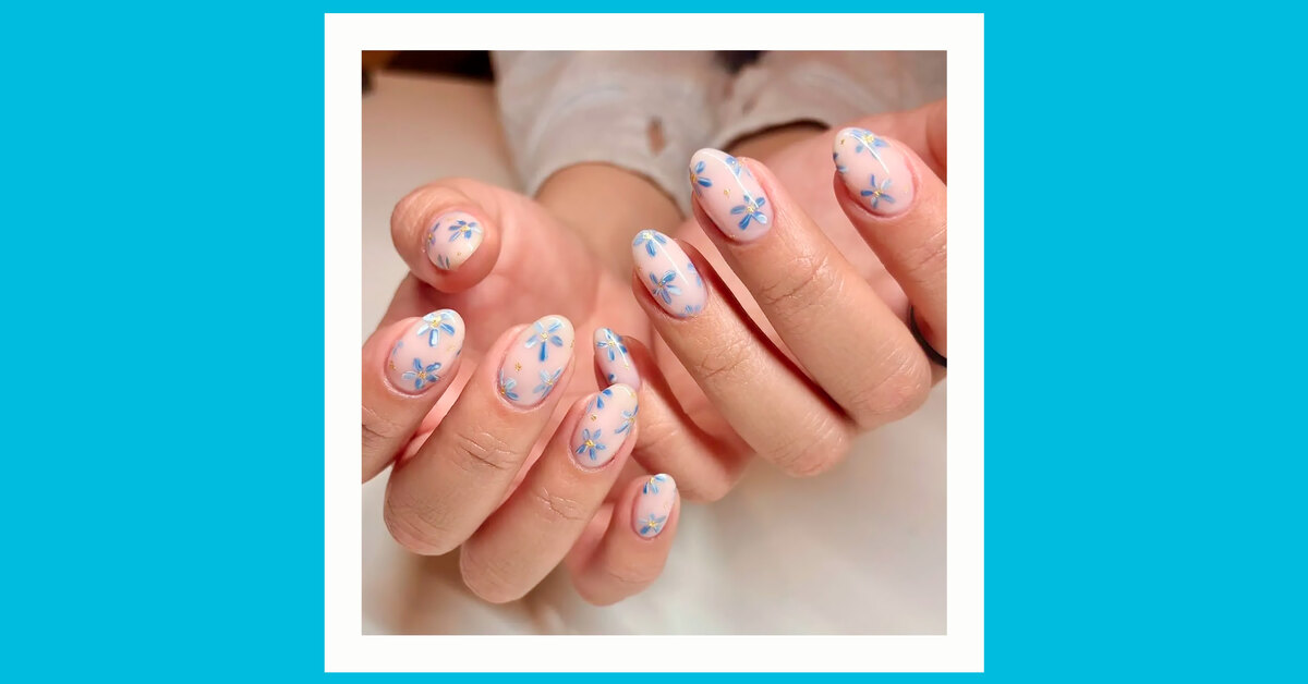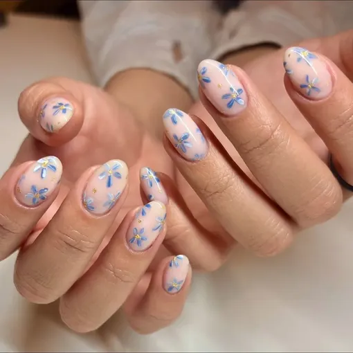 Тебе не нужно быть Клодом Моне, чтобы повторить такую красоту дома или просто носить ее с гордостью во время очередной весенней прогулки. Чтобы нарисовать выразительные цветы на ногтях, тебе нужна молочная база под голубые лепестки (буквально 1-2 слоя) и классный глянцевый топ.