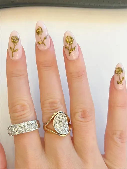 Здесь все безумно просто: нюдовая база и золотой цветок. Но эффект сносшибателен! Опять же, как и в предыдущих вариантах, розу можно нарисовать вручную, если хватает смелости, или заменить рисунок на прочную и объемную наклейку.