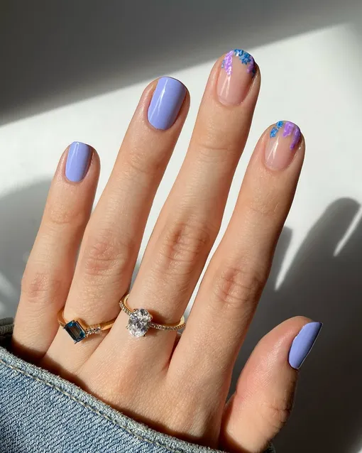 Пастельные оттенки лилового и голубого сейчас в фаворитах ногтевого дизайна, потому можешь использовать их по полной. Можешь добавить акцент в маникюр, нарисовав маленькие цветочки вместо классической французской «улыбки».