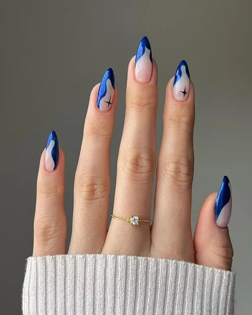От классического френча здесь осталось разве что название. Белый цвет в этом дизайне заменен на насыщенный синий, а симметричные «улыбочки» — на абстракцию. Рисунки звезд, в свою очередь, добавляют маникюру волшебства и напоминают о безмятежности зимнего неба.