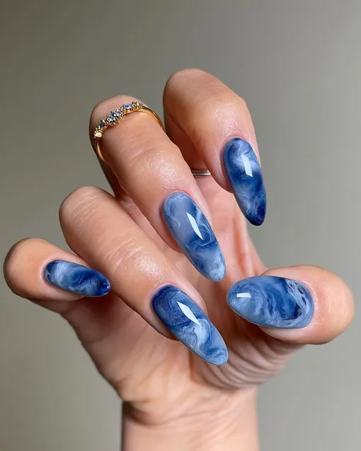 А этот абстрактный рисунок на ногтях напоминает нам то ли клубящийся из трубы дым на фоне ночного зимнего неба, то ли волшебный и неповторимый узор на поверхности из дорогого синего мрамора.