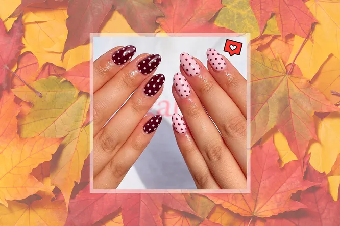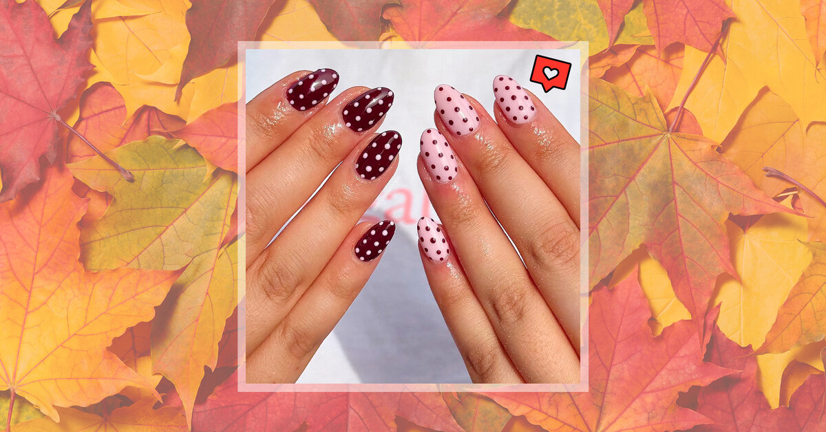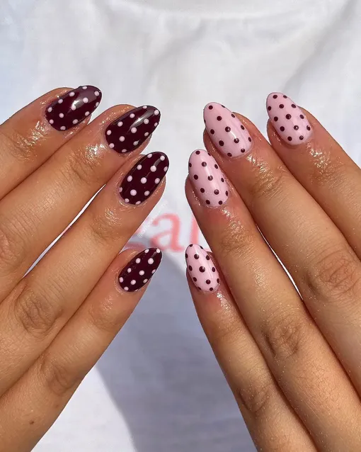 Сочетание темно-бордового и пастельно-розового с игривыми точками — это дань ретро и осенним узорам. Маникюр напоминает уютный кардиган в горошек, который хочется надеть в прохладный вечер. Отличный выбор для тех, кто любит чуть дерзкий, но все равно женственный стиль.
