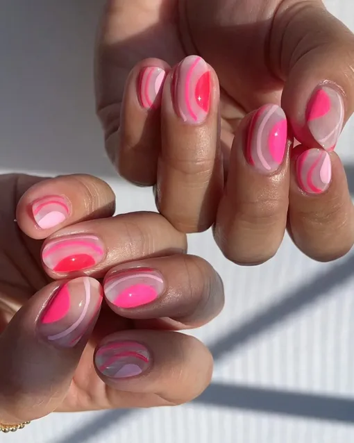 Яркие волны розовых и красных оттенков создают эффект движения и динамики. Это маникюр, который отлично отражает настроение сентября — он как теплый свитер яркого цвета, который сразу выделяется среди серых будней. Такой дизайн подойдет тем, кто хочет сохранить энергию лета в новом сезоне.