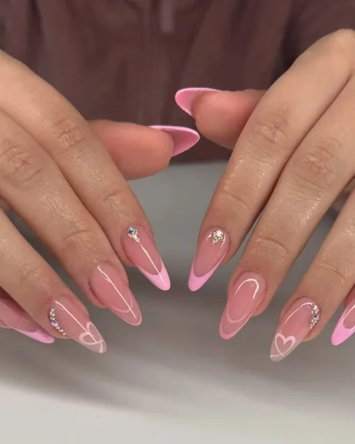 Этот вариант подойдет самым романтичным натурам. Мягкий розовый френч дополнен нежными белыми сердечками и сияющими кристаллами. Такой дизайн будто подводит итог лету, сохраняя легкость и воздушность, но при этом идеально ложится в осеннюю атмосферу — ведь именно в холодные дни хочется больше тепла и нежности.