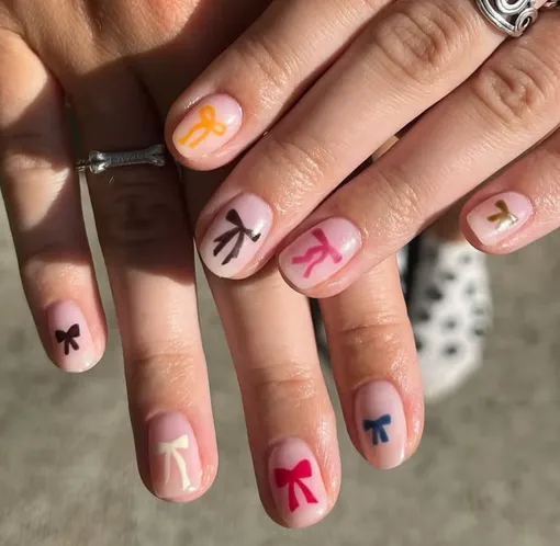 Лично я все еще не готова расставаться с эстетикой милоты и кокеток, и этот вариант — ее более игривое прочтение. Просто нарисуй бантик любого цвета на нейтральной или молочной базе, и маникюр тут же заиграет новыми красками.