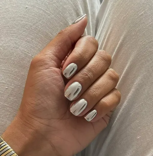 Этот зеркальный маникюр — чистая дерзость и настоящий стиль: отражающий эффект особенно стильно смотрится на мягком квадрате.