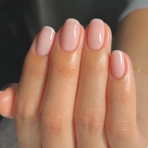 Блестящие ногти — всегда хорошая идея, особенно в сочетании с «голой» базой и аккуратной формой мягкого квадрата.