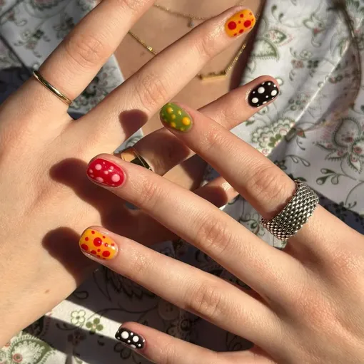 Маникюр в горошек уже не первый год на пике популярности, а вариант с разными оттенками на каждом ногте выглядит особенно круто в весенний сезон.
