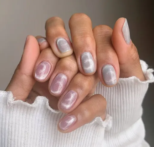 Называй как хочешь — хром, металлик или глиттер, — этот маникюр, созданный с помощью магнита, буквально гипнотизирует своей красотой. Ну и сочетание дымчатого розового и серебряного оттенков выглядит идеальным.