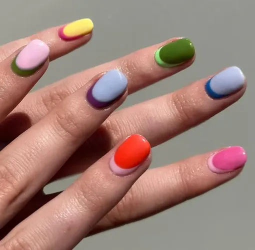 Не можешь выбрать один оттенок? И не нужно — этот разноцветный маникюр как раз про свободу выбора. А если хочется добавить немного дизайна, то обратный французский маникюр станет самым удачным решением.